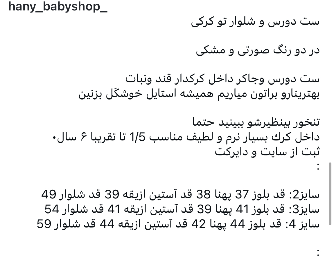 سايز3: قد بلوز 41 پهنا 39 قد آستين ازيقه 41 قد شلوار 54
