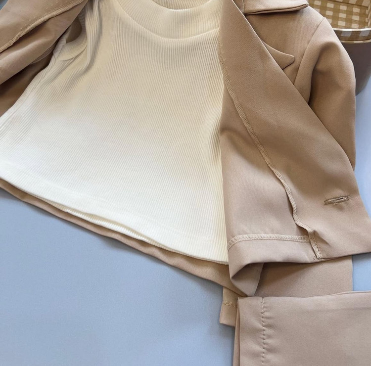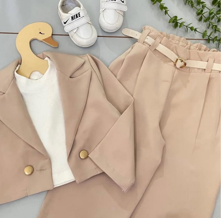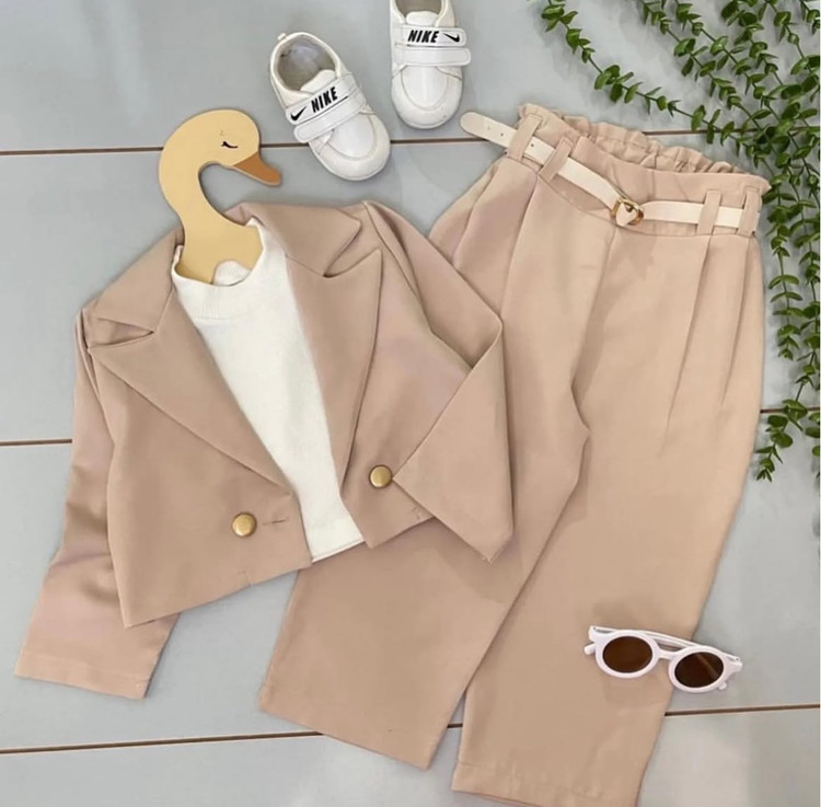 شیک تر از این نمیشه یه ست چهار تکه همه چی تمومه کت و شلوار و تاپ و کمربند مدل کت و تاپ کوتاهه بر اساس قد شلوار انتخاب کنید سایز بندی در اسلاید آخر حدودی مناسب یکسال ونیم تا ۷ سال با احترام=